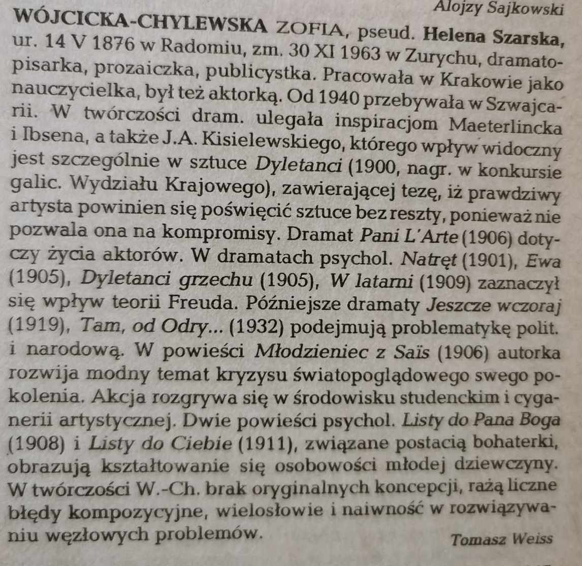 Tomasz Weiss, Wójcicka-Chylewska Zofia. [w:] Literatura polska: przewodnik encyklopedyczny. red. Julian Krzyżanowski, Czesław Hernas. T. 2: N-Ż. Warszawa: Państwowe Wydawnictwo Naukowe, 1991.